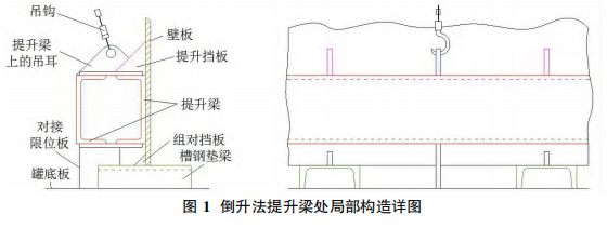 发布日期:2022-07-02 10:26:02 访问量:1540往常施工时,将提升吊耳直接焊接在壁板上,该方式常导致吊耳处壁板拉应力过大而变形。本项目采用设置提升梁焊接吊耳的方法。即在壁板下部设置由两根槽钢对扣而成的提升梁,两侧按间距1m加坠板焊接而成,提升梁卷弧成外缘与罐体内径相同的弧形。提升梁分成数段,每节提升梁对应安装2根提升立柱。在提升梁的缀板上焊接壁板对接的限位钢挡板。提升梁上的吊耳焊接在提升立柱的正下方。在吊耳两侧各1m长度内的提升梁增设缀板加强。提升梁采用龙门卡具连接储罐壁板。龙门卡具设置位置不宜距吊耳太近,以免壁板受拉变形,距离太远则易使提升梁扭曲变形。提升梁处局部构造见图1所示。