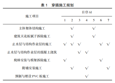 为确保穿插施工方案在实际施工中可起到一定效果,应对不同穿插施工环节的劳动力资源做好对 应的规划,包括在不同施工环节如何更好地组织施 工材料、合理调配施工过程中的人力资源等。只有做好对多个环节的合理化调配,才能避免由于个别施工工序规划不当导致的整体施工工期拖延问题。同 时,应对工程施工中的所有技术人员进行交底,并定 期进行工程汇总,要求不同部门的施工人员汇报现 场施工进度,以掌握工程实际实施情况,便于后期施 工方对工程实施进度进行及时调整。此外,穿插施工过程中做好防水工作,包括门窗防水、伸缩缝防水、变形缝防水等,并完善建筑结构排水渠道。在穿插施工中,应注意对施工技术的不断更新与调整,只有不断尝试将新技术引进工程实际,才能确保实施的工程项目可满足建筑市场可持续发展需求。