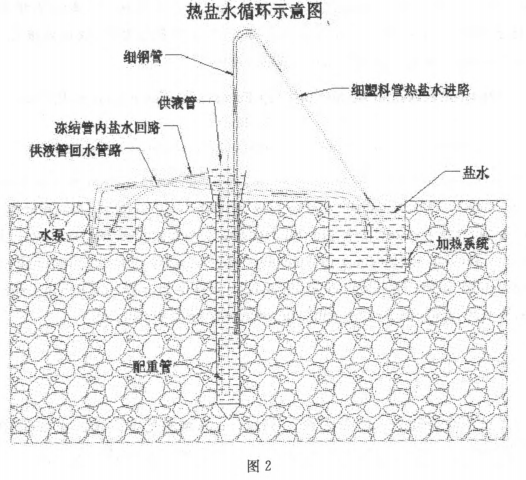 (5)利用这种方法6个孔有一个未拔塑料管,成功恢复循环,其余5个孔由于结晶严重无法恢复循环,只能拔出供液管重新下放,为减少环形空间结晶体对供液管的阻力,保证供液管能顺利拔出,采用热盐水循环法,一边从细钢管里面冲,一边下放细钢管,直至下放到冻结管底部,再拔供液管时阻力很小,待供液管成功拔出后,对该冻结孔进行冲孔,重新下放新塑料管,恢复冻结,通过这种方法使5个冻结孔成功恢复循环,挽救冻结孔避免报废,避免打补孔,一定程度上最大限度减少资金损失。