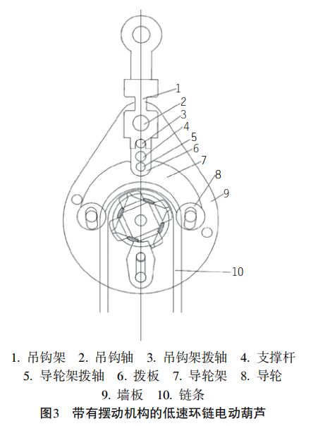 摆动机构包括导轮架和导轮。导轮架为对称结构,导轮架和吊钩架之间设有转动连接结构,转动连接结构的连接处位于导轮架的对称轴上,导轮转动连接于导轮架对称的两端。墙板设有弧形导槽,导槽与导轮的轴配合形成限位结构,导轮的轴滑动连接于所述墙板上。转动连接结构包括拨板、支撑杆和拨轴,拨板的两端通过拨轴转动连接于吊钩架和导轮架。墙板设有限位柱,导轮架上设有缺口,限位柱和缺口配合,缺口为弧形,缺口的长度小于等于所述导槽的长度。