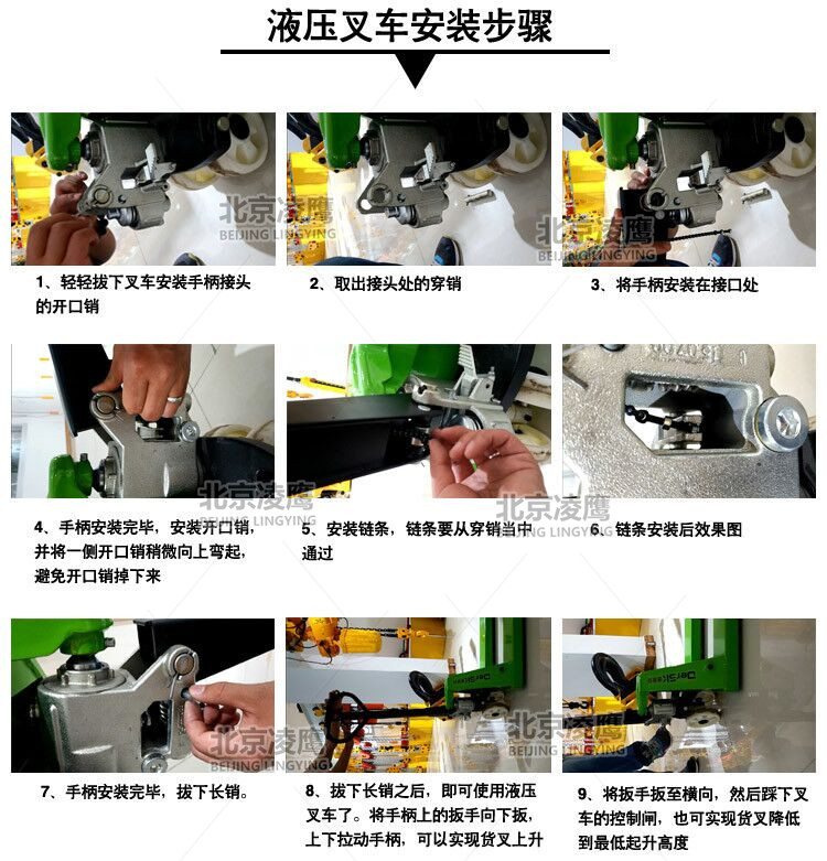 轻轻拔下叉车安装手柄接头的开口销→取出接头处的穿销→将手柄安装在接口处→手柄安装完毕,安装开口销,并将一侧开口销稍微向上弯起,避免开口销掉下来→安装链条,链条要从穿销当中通过→链条安装后效果图→手柄安装完毕,拔下长销→拔下长销后,即可使用液压叉车了。将手柄上的扳手上的扳手向下扳,上下拉动手柄,可以实现货叉上升→将扳手扳至横向,然后踩下叉车的控制闸,也可实现货叉降低到最低起升高度。